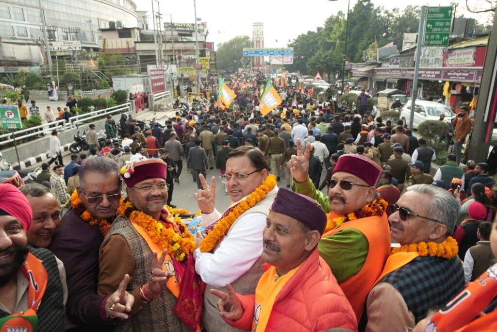 देहरादून: चुनाव प्रचार का शोर थमने से पहले प्रत्याशियों ने चुनाव मैदान में अपना पूरा जोर लगाया। प्रचार थमने से पहले भाजपा के मेयर प्रत्याशी सौरभ थपलियाल के समर्थन में धाकड़ धामी की धमक भी नजर आई। सीएम पुष्कर धामी ने सौरभ थपलियाल के समर्थन में रोड शो किया। बीजेपी महानगर कार्यालय से रोड शो की शुरुआत हुई जिसमें भाजपा कार्यकर्ताओं का हुजूम उमड़ा। रोड शो गांधी पार्क , घंटाघर होता हुआ पल्टन बाजार पहुंचा जहां पर पुष्प वर्षा के जरिये जोरदार स्वागत किया गया। रोड शो में सीएम पुष्कर धामी के अलावा कैबिनेट मंत्री गणेश जोशी व सतपाल महाराज भी मौजूद रहे। इसके अलावा बीजेपी विधायक बृजभूषण गैरोला , विधायक खजानदास, विधायक विनोद चमोली , विधायक सविता कपूर , भाजपा महिला मोर्चा की राष्ट्रीय महामंत्री दीप्ति रावत भी मौजूद रहीं।