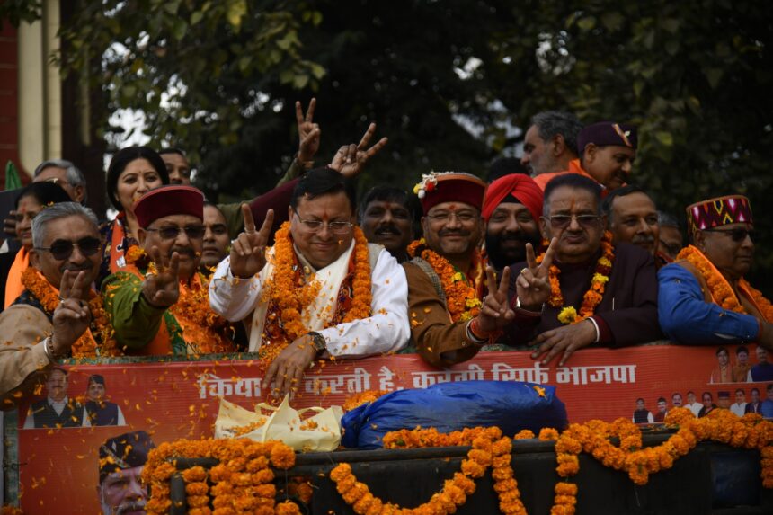 देहरादून: चुनाव प्रचार का शोर थमने से पहले प्रत्याशियों ने चुनाव मैदान में अपना पूरा जोर लगाया। प्रचार थमने से पहले भाजपा के मेयर प्रत्याशी सौरभ थपलियाल के समर्थन में धाकड़ धामी की धमक भी नजर आई। सीएम पुष्कर धामी ने सौरभ थपलियाल के समर्थन में रोड शो किया। बीजेपी महानगर कार्यालय से रोड शो की शुरुआत हुई जिसमें भाजपा कार्यकर्ताओं का हुजूम उमड़ा। रोड शो गांधी पार्क , घंटाघर होता हुआ पल्टन बाजार पहुंचा जहां पर पुष्प वर्षा के जरिये जोरदार स्वागत किया गया। रोड शो में सीएम पुष्कर धामी के अलावा कैबिनेट मंत्री गणेश जोशी व सतपाल महाराज भी मौजूद रहे। इसके अलावा बीजेपी विधायक बृजभूषण गैरोला , विधायक खजानदास, विधायक विनोद चमोली , विधायक सविता कपूर , भाजपा महिला मोर्चा की राष्ट्रीय महामंत्री दीप्ति रावत भी मौजूद रहीं।