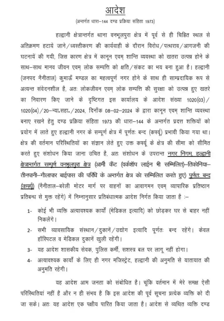 अब नगर निगम, हल्द्वानी क्षेत्रान्तर्गत सम्पूर्ण वनमूलपुरा क्षेत्र (आर्मी कैंट (वर्कशॉप लाईन भी सम्मिलित) तिकोनिया- तीनपानी- गौलापार बाईपास की परिधि के अन्तर्गत क्षेत्र को सम्मिलित करते हुए) पूर्णतः बन्द (कर्फ्यू) (नैनीताल-बरेली मोटर मार्ग पर वाहनों का आवागमन एवम् व्यापारिक प्रतिष्ठान प्रतिबन्ध से मुक्त रहेंगे।