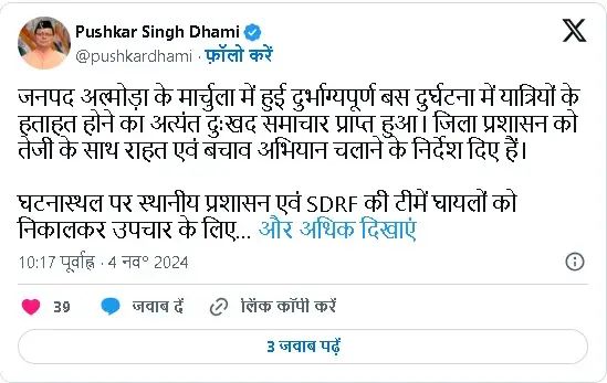 मुख्यमंत्री पुष्कर सिंह धामी ने इस दुखद घटना पर गहरा दुख व्यक्त किया है। उन्होंने सोशल मीडिया पर लिखा, “जनपद अल्मोड़ा के मार्चुला में हुई दुर्भाग्यपूर्ण बस दुर्घटना में यात्रियों के हताहत होने का अत्यंत दुःखद समाचार प्राप्त हुआ।” उन्होंने जिला प्रशासन को राहत और बचाव अभियान को तेजी से चलाने के निर्देश दिए हैं।